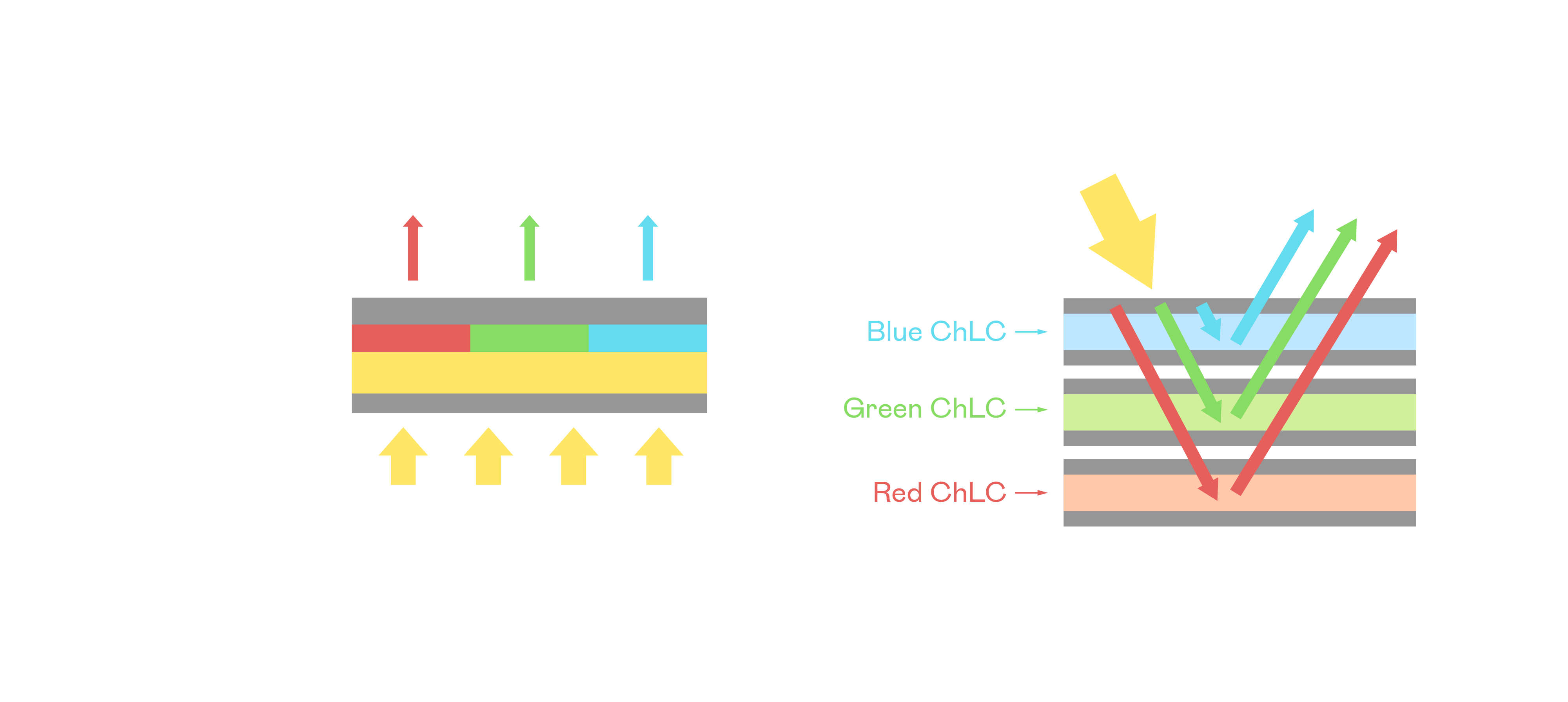 AG百家乐试玩胆固醇液晶显示器是由红、绿、蓝三层胆固醇液晶面板堆叠而成,并采用无彩色滤光片设计,减少环境光在反射过程中的损耗。
